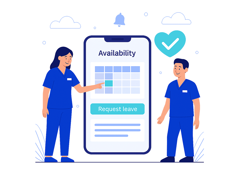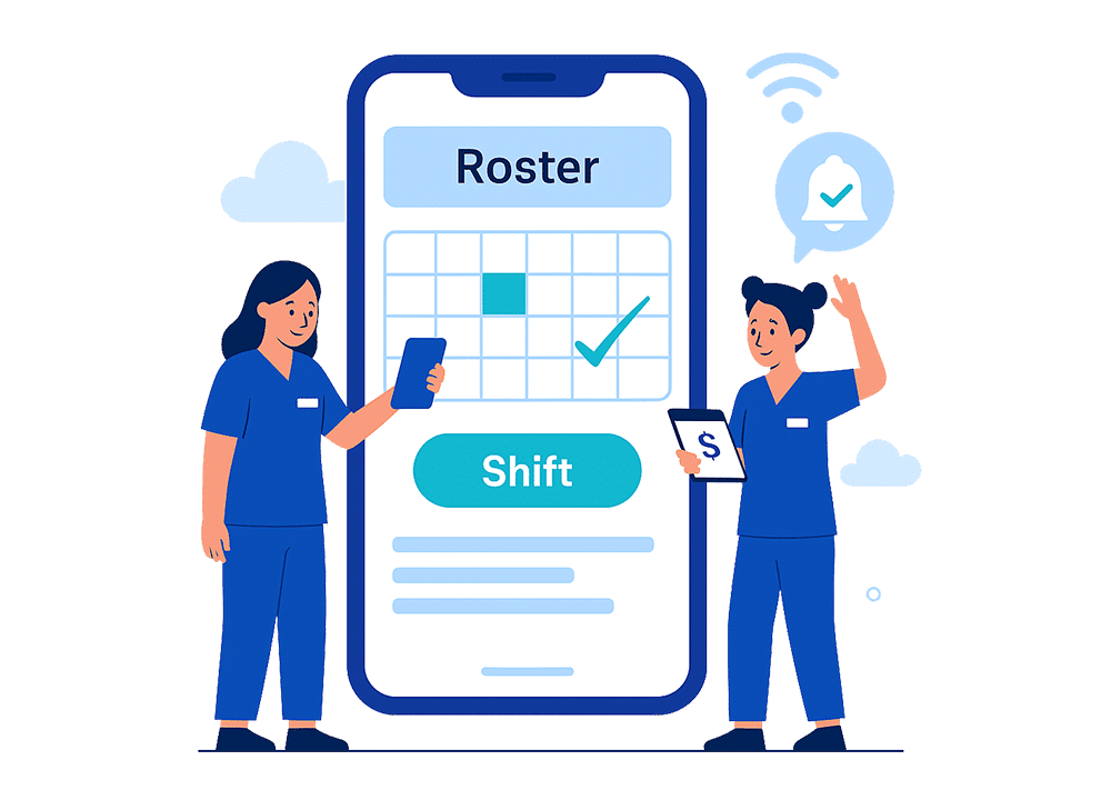 - Rosters on the Run – Staff can check schedules, request leave, and pick up shifts from their phone.